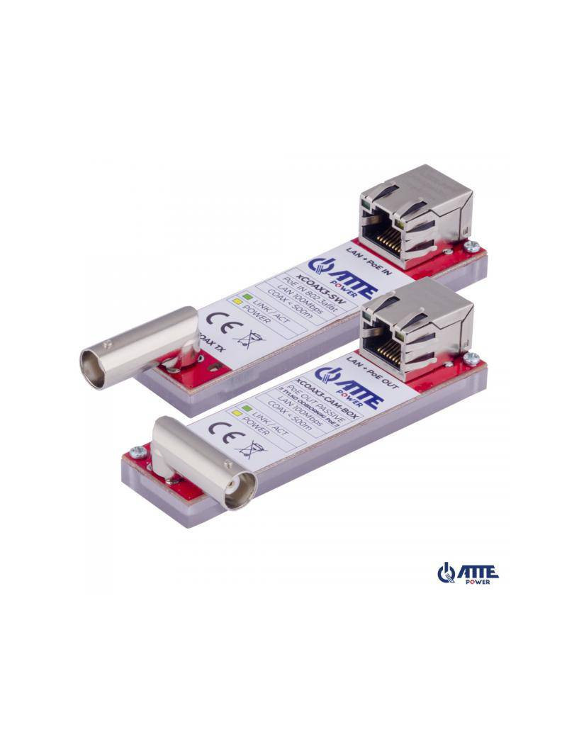 Zestaw aktywnych konwerterów do transmisji Ethernet oraz PoE po koncentryku, 1 kanał 100Mbps, PoE IN 802.3at/af lub Passive (xCOAX3-SW), PoE OUT Passive (xCOAX3-CAM-BOX), zasięg do 500m, wersja BOX z kątowym złączem BNC umożliwia montaż xCOAX3-CAM-BOX w podstawie kamery, złącza RJ45/BNC_Fonwerterów xCOAX do transmisji Ethernet oraz PoE po koncentryku 1 kanał 10/100Mbps PoE IN 802.3at/af (xCOAX SWITCH) PoE OUT PASSIVE (xCOAX CAMERA) zasięg do 200m złącza RJ45/BNC_F typu ASET-xCOAX