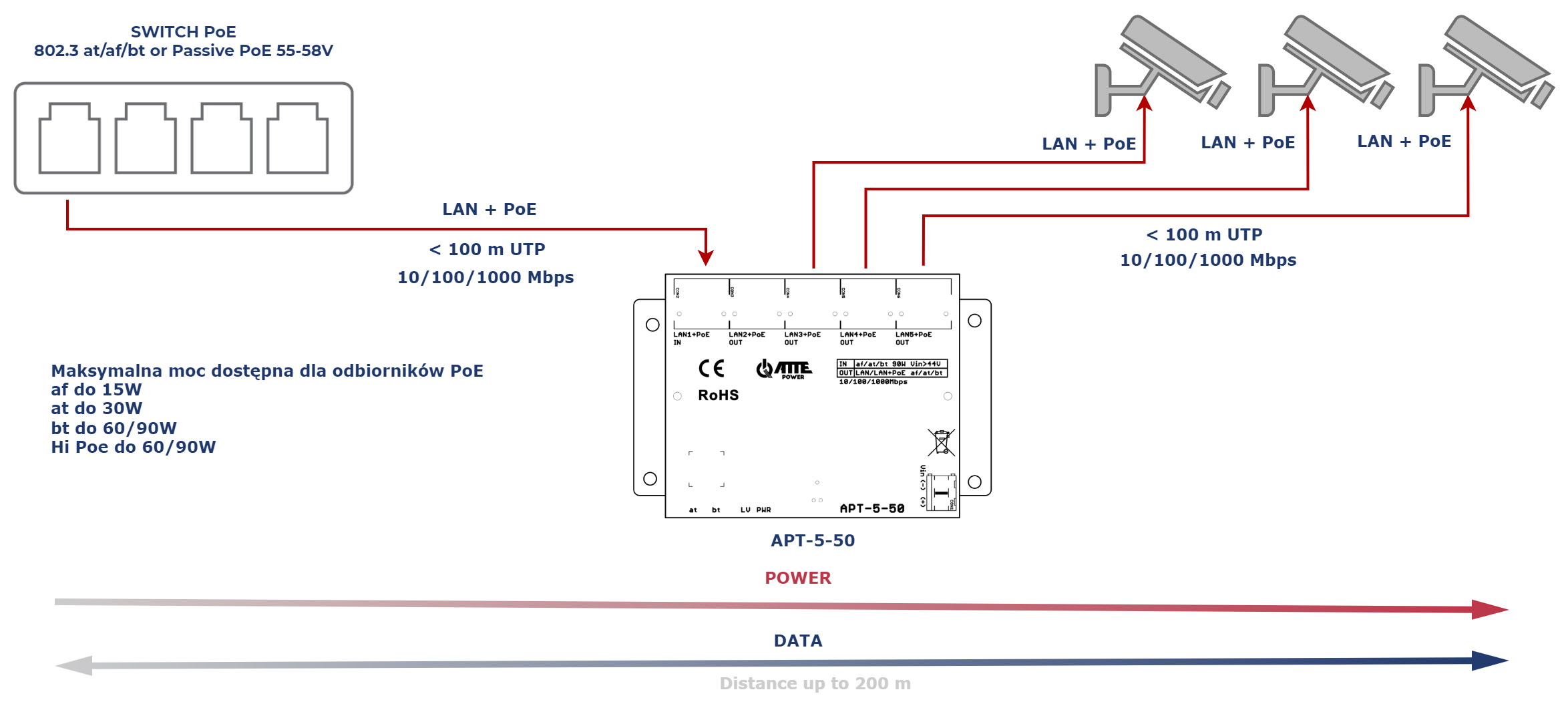Urządzenia serii APT (Atte Power Tree) zapewniają kompatybilność ze standardami IEEE 802.3 at/af/bt90 jako odbiorniki zasilania PoE oraz IEEE 802.3 at/af/bt60 na wszystkich portach wyjściowych. Po podłączeniu urządzenia do portów 2-5 następuje identyfikacja odbiornika i jeżeli jest to urządzenie zasilane z PoE włączone zostanie zasilanie w porcie.